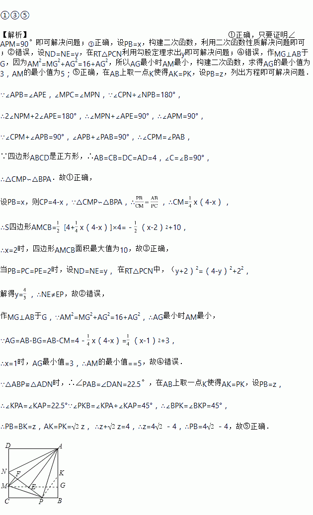 如图,边长为4的正方形ABCD中,P是BC边上一动点(不含B、C点).将△ABP沿直线AP翻折,点B落在点E处;在CD上有一点M,使得将△CMP沿直线MP翻折后,点C落在直线PE上的点F处,直线PE交CD于点N,连接MA,NA.则以下结论中正确的有_____________(写出所有正确结论的序号).