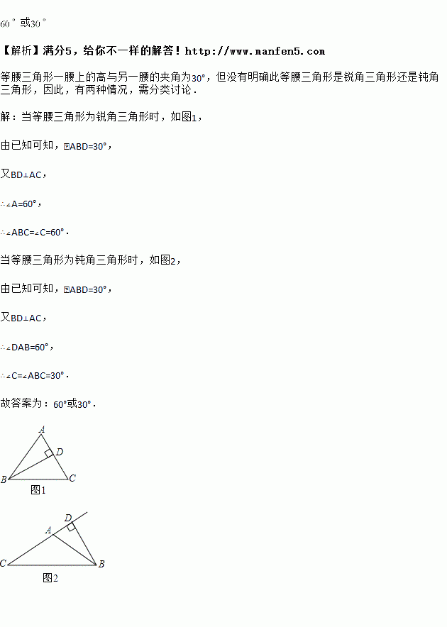 等腰三角形腰上的高与另一腰的夹角为 30°,则底角度数是_____或______.