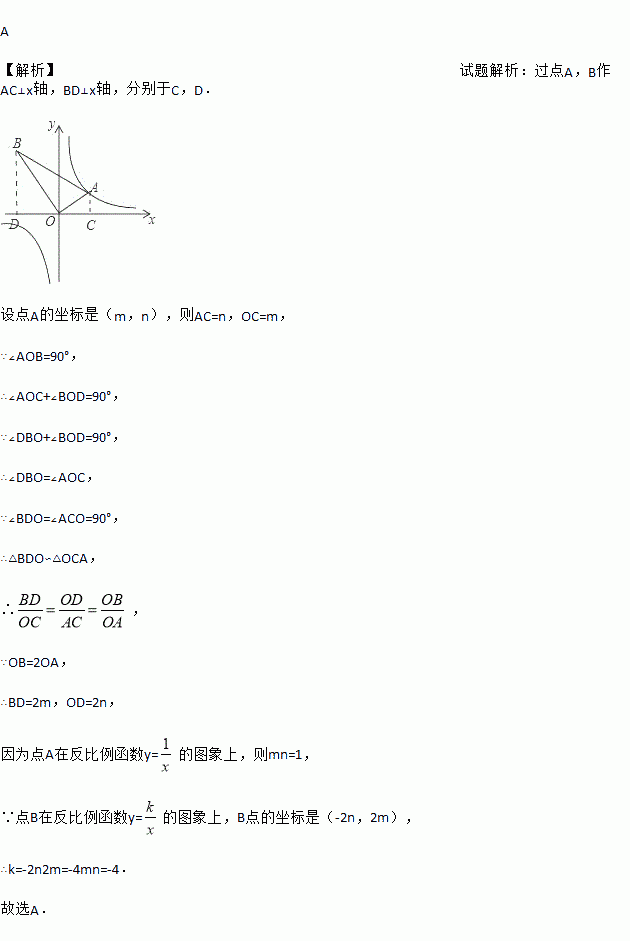 A 【解析】试题解析:过点A,B作AC⊥x轴,BD⊥x轴,分别于C,D. 设点A的坐标是(m,n),则AC=n,OC=m, ∵∠AOB=90°, ∴∠AOC+∠BOD=90°, ∵∠DBO+∠BOD=90°, ∴∠DBO=∠AOC, ∵∠BDO=∠ACO=90°, ∴△BDO∽△OCA, ∴, ∵OB=2OA, ∴BD=2m,OD=...