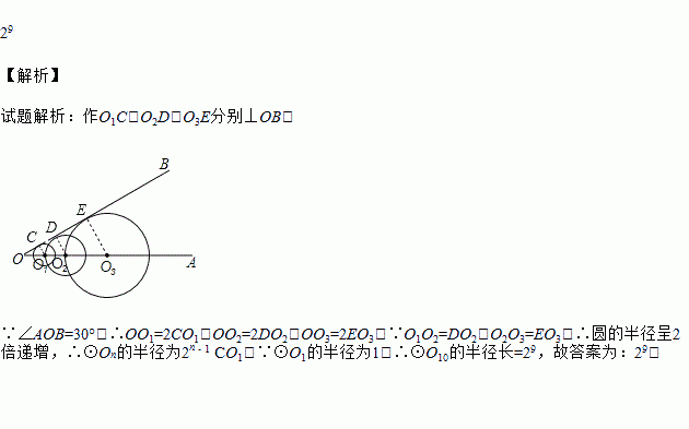 如图,已知∠AOB=30°,在射线OA上取点O1,以点O1为圆心的圆与OB相切;在射线O1A上取点O2,以点O2为圆心,O2O1为半径的圆与OB相切;在射线O2A上取点O3,以点O3为圆心,O3O2为半径的圆与OB相切;…;在射线O9A上取点O10,以点O10为圆心,O10O9为半径的圆与OB相切.若⊙O1的半径为1,则⊙O10的半径是________.
