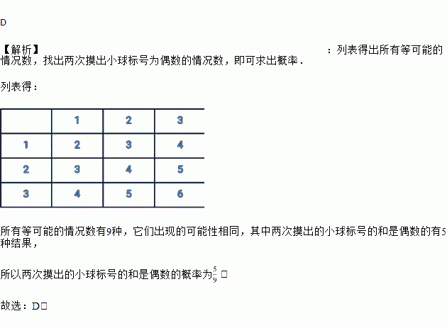 一个不透明的袋子中有三个完全相同的小球,把它们分别标号为1,2,3,随机摸出一个小球,记下标号后放回,再随机摸出一个小球并记下标号,两次摸出的小球标号的和是偶数的概率是( )