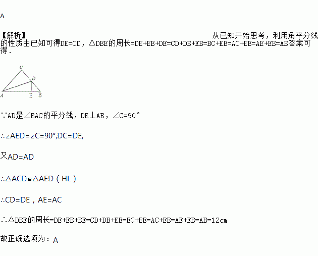 △ABC中,∠C=90°,AC=BC,AD是∠BAC的平分线,DE⊥AB,垂足为E,若AB=12cm,则△DBE的周长为( )
