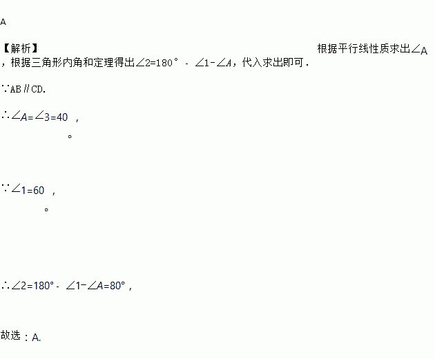 如图,是婴儿车的平面示意图,其中AB∥CD,∠1=60,∠3=40,那么∠2的度数为( )
