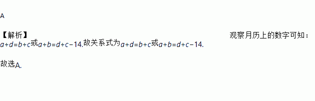 A 【解析】观察月历上的数字可知:a+d=b+c或a+b=d+c?14.故关系式为a+d=b+c或a+b=d+c?14. 故选A.