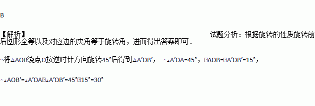 如图,将△AOB绕点O按逆时针方向旋转45°后得到△A'OB',若∠AOB=15°,则∠AOB'的度数是( ).