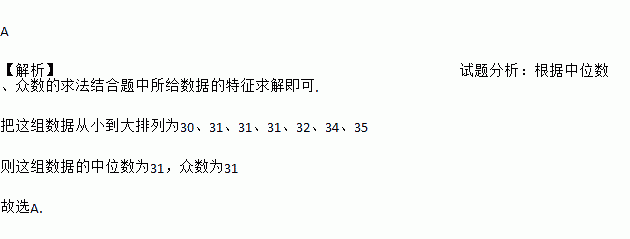 某市一周空气质量报告中,某项污染指数的数据是:31,35,31,34,30,32,31,这组数据的中位数,众数分别是( )