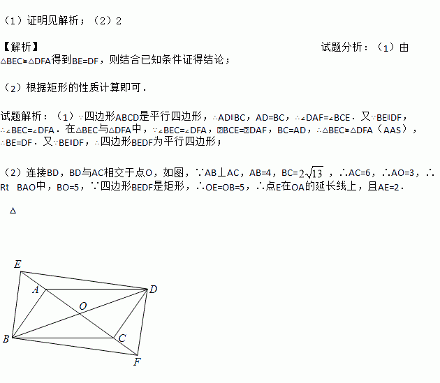 (2)若AB⊥AC,AB=4,BC=2,当四边形BEDF为矩形时,求线段AE的长.