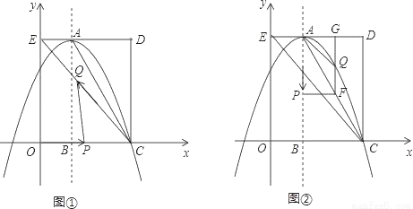 (14分)如图,在平面直角坐标系中,矩形OCDE的三个顶点分别是C(3,0),D(3,4),E(0,4).点A在DE上,以A为顶点的抛物线过点C,且对称轴x=1交x轴于点B.连接EC,AC.点P,Q为动点,设运动时间为t秒.
