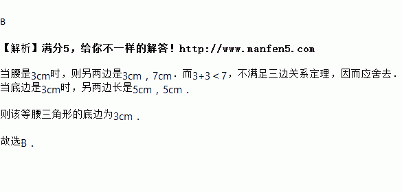 等腰三角形的周长为13 cm,其中一边长为3 cm,则该等腰三角形的底边为( )