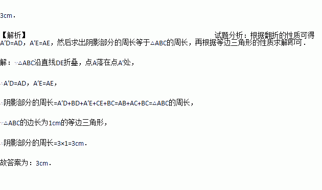 如图,等边三角形ABC的边长为1cm,DE分别是AB、AC上的点,将△ABC沿直线DE折叠,点A落在点A′处,在△ABC外部,则阴影部分的周长为 .