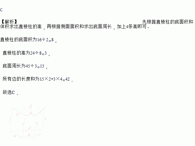 下图为一个直棱柱,其中两底面为全等的梯形,其面积和为16,四个侧面均为长方形,其面积和为45.若此直棱柱的体积为24,则所有边的长度和为( )