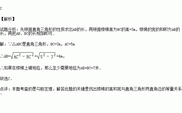 如图所示:是一段楼梯,高BC是3m,斜边AC是5m,如果在楼梯上铺地毯,那么至少需要地毯( )