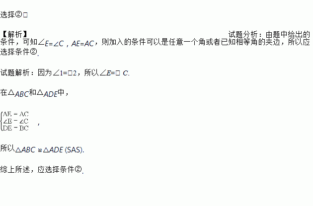 Èçͼ£¬µãDÔÚBCÉÏ£¬¡Ï1£½¡Ï2£¬AE£½AC£¬ÏÂÃæÓÐÈý¸öÌõ¼þ£º¢ÙAB£½AD£»¢ÚBC£½DE£»¢Û¡ÏE£½¡ÏC£¬ÇëÄã´ÓËù¸øÌõ¼þ¢Ù¢Ú¢ÛÖÐѡһ¸öÌõ¼þ£¬Ê¹¡÷ABC¡Õ¡÷ADE£¬²¢ËµÃ÷ÀíÓÉ£®