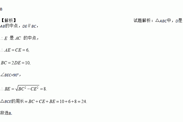 如图,△ABC中,D是AB的中点,DE∥BC,连接BE.若AE=6,DE=5,∠BEC=90°,则△BCE的周长是( )