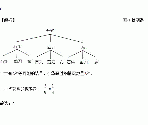 小明和小华玩“石头、剪子、布”的游戏,若随机出手一次,则小华获胜的概率是( )