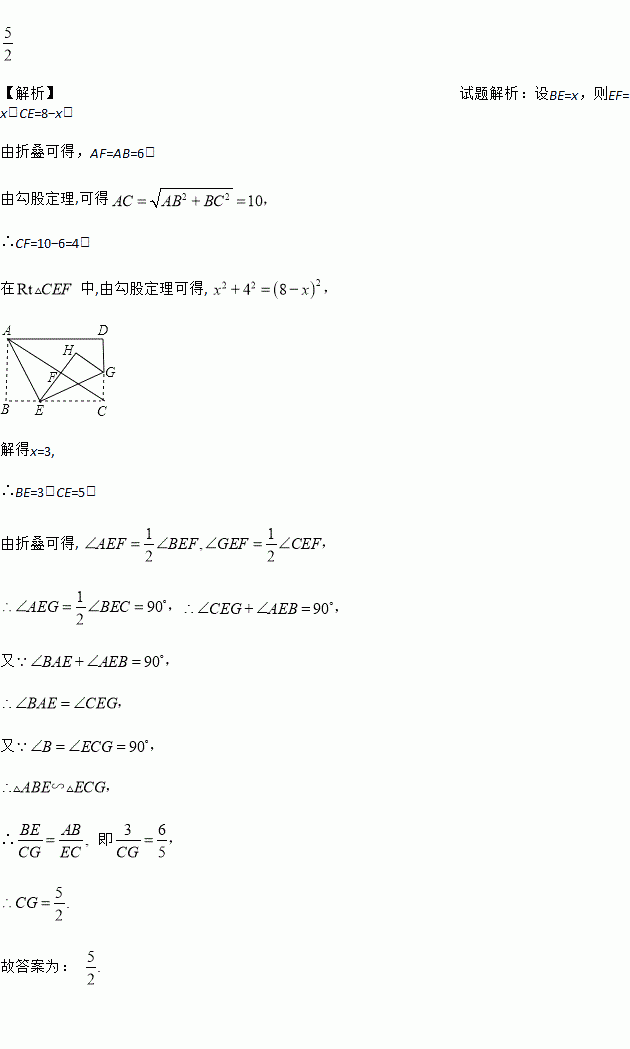 如图,将矩形纸片ABCD沿AE折叠,使点B落在对角线AC上的点F处,再沿EG折叠,使点C落在矩形内的点H处,且E、F、H在同一直线上,若AB=6,BC=8,则CG的长是_____.