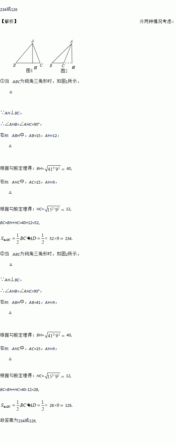 234或126 【解析】分两种情况考虑: ①当△ABC为锐角三角形时,如图1所示, ∵AH⊥BC, ∴∠AHB=∠AHC=90°, 在Rt△ABH中,AB=15,AH=12, 根据勾股定理得:BH=40, 在Rt△AHC中,AC=15,AH=9, 根据勾股定理得:HC=12, BC=BH+HC=40+12=52, 52234. ②当△ABC为钝角三角形...
