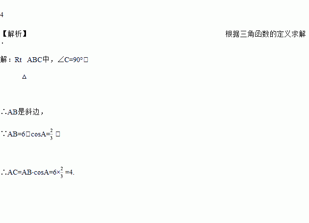 在Rt△ABC中,∠C=90°,如果AB=6,cosA=,那么AC=________.
