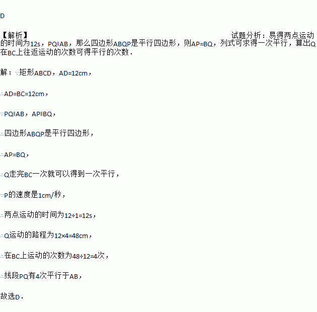 如图所示,在矩形ABCD中, AB=4cm , AD=12cm , P 点在AD边上以每秒1cm 的速度从A向D运动,点Q在 BC边上,以每秒4cm 的速度从C点出发,在CB间往返运动,两点同时出发,待P点到达 D点为止,在这段时间内,线段 PQ平行于AB的次数为( )