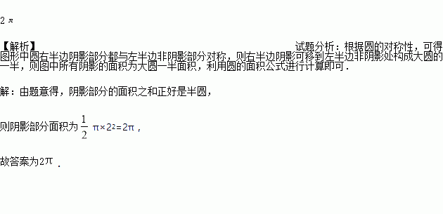 如图是两个同心圆,其中两条直径互相垂直,大圆的半径是2,则其阴影部分的面积之和为 (结果保留π).