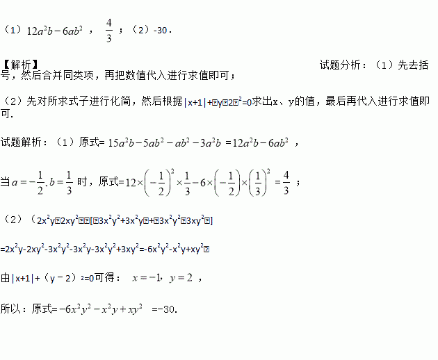 (1), ;(2)-30. 【解析】试题分析:(1)先去括号,然后合并同类项,再把数值代入进行求值即可; (2)先对所求式子进行化简,然后根据|x+1|+(y﹣2)2=0求出x、y的值,最后再代入进行求值即可. 试题解析:(1)原式= =, 当时,原式==; (2)(2x2y﹣2xy2)﹣[(3x2y2+3x2y)+(3x2y2﹣3xy2)] =2x2y-2xy...