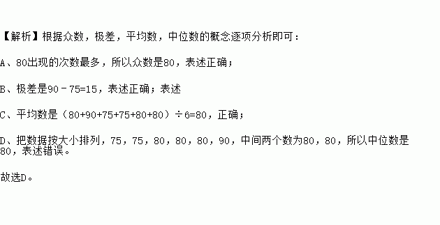 某班六名同学体能测试成绩(分)如下:80,90,75,75,80,80,对这组数据表述错误的是【 】