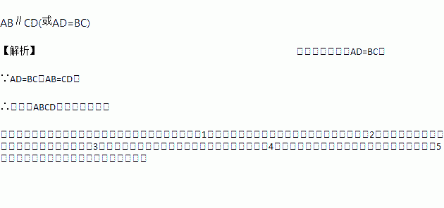 已知,如图在四边形ABCD中,AB=CD,则添加一个__________________ 条件(只需填写一种)可以使得四边形ABCD为平行四边形。