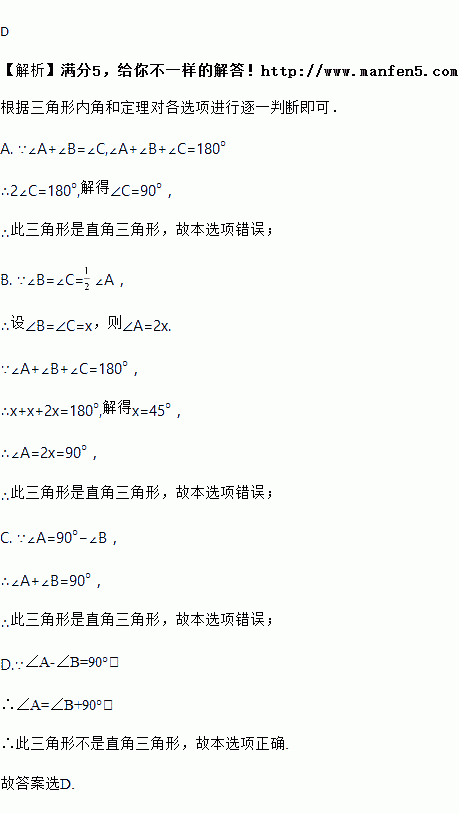 A. ∠A+∠B=∠C B. ∠B=∠C=∠A