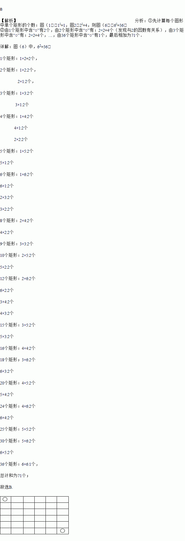 如图所示,图(1)中含“○”的矩形有1个,图(2)中含“○”的矩形有7个,图(3)中含“○”的矩形有17个,按此规律,图(6)中含“○”的矩形有( )