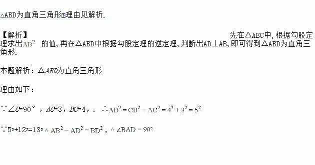 如图,∠C=90°,AC=3,BC=4,AD=12,BD=13,试判断△ABD的形状,并说明理由.
