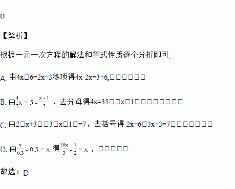 A. 由4x﹣6=2x+3移项得4x+2x=3﹣6