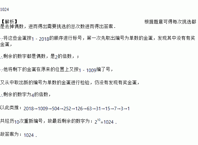 为了从2018枚外形相同的金蛋中找出唯一的有奖金蛋,检查员将这些金蛋按1﹣2018的顺序进行标号.第一次先取出编号为单数的金蛋,发现其中没有有奖金蛋,他将剩下的金蛋在原来的位置上又按1﹣1009编了号(即原来的2号变为1号,原来的4号变为2号……原来的2018号变为1009号),又从中取出新的编号为单数的金蛋进行检验,仍没有发现有奖金蛋……如此下去,检查到最后一枚金蛋才是有奖金蛋,问这枚有奖金蛋最初的编号是_____.