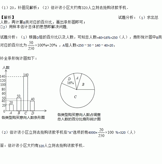 (1)20,补图见解析;(2)估计该小区大约有320人立刻去抢购该款手机. 【解析】试题分析:(1)求出总人数,再计算B类对应的百分比,画出条形图即可; (2)用样本估计总体的思想即解决问题. 试题分析:(1)根据D组的百分比以及人数,可知总人数=40÷16%=250(人),扇形统计图中B类对应的百分比为,A组人数=250﹣50﹣140﹣40=20, 补全条形统计图如下: ...