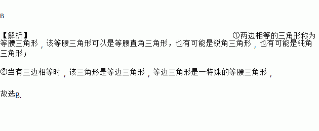 B 【解析】①两边相等的三角形称为等腰三角形,该等腰三角形可以是等腰直角三角形,也有可能是锐角三角形,也有可能是钝角三角形; ②当有三边相等时,该三角形是等边三角形,等边三角形是一特殊的等腰三角形, 故选B.