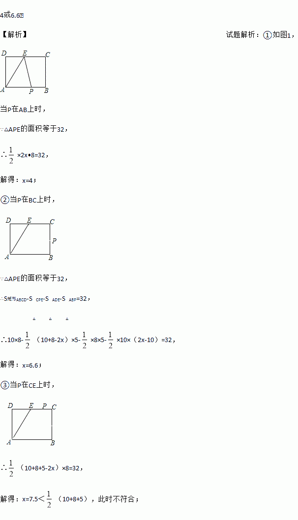 如图,已知在长方形ABCD中,AB=10cm,BC=8cm,点E是CD中点,动点P从A点出发,以每秒2cm的速度沿A→B→C→E运动,最终到达点E,若点P运动的时间为x秒,那么当x=________s时,△APE的面积等于32cm.
