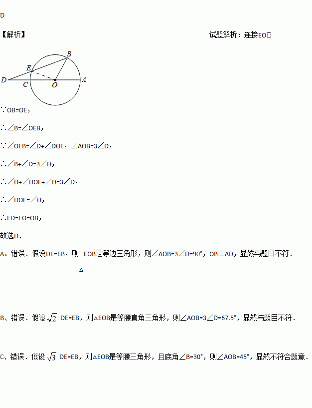 如图,已知AC是⊙O的直径,点B在圆周上(不与A、C重合),点D在AC的延长线上,连接BD交⊙O于点E,若∠AOB=3∠ADB,则( )