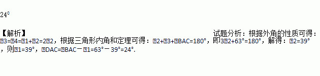 如图,在△ABC中,D是BC边上一点,∠1=∠2,∠3=∠4,∠BAC=63°,则∠DAC=_______