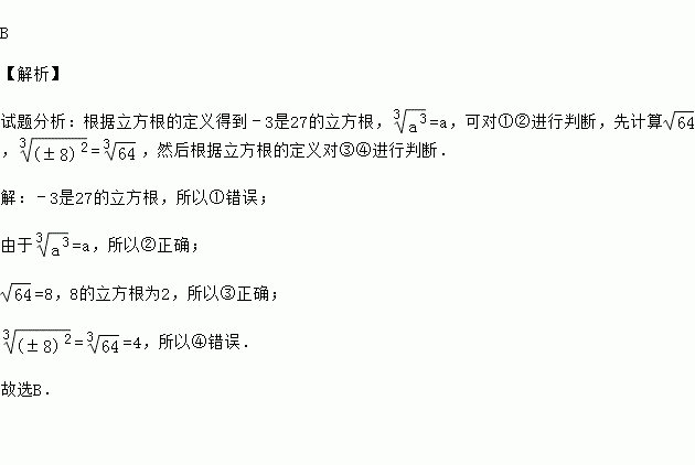 下列计算或说法:①±3都是27的立方根;②=a;③的立方根是2;④=±4,其中正确的个数是( )