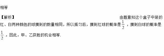 一个盒子里装有数量相同的红、白两种颜色的球,每个球除了颜色外都相同,摸到红球甲胜,摸到白球乙胜,如果摸球以前先将盒子里的球摇匀,则甲、乙获胜的机会__________.