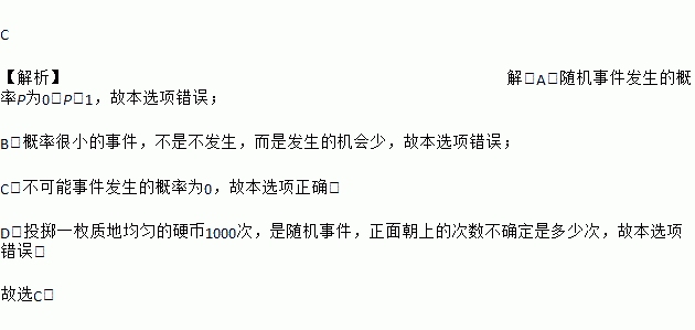 C 【解析】解:A.随机事件发生的概率P为0<P<1,故本选项错误; B.概率很小的事件,不是不发生,而是发生的机会少,故本选项错误; C.不可能事件发生的概率为0,故本选项正确; D.投掷一枚质地均匀的硬币1000次,是随机事件,正面朝上的次数不确定是多少次,故本选项错误. 故选C.