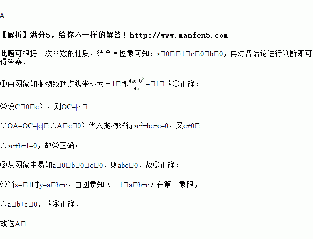 已知二次函数y=ax2+bx+c的图象如图所示,OA=OC,则由抛物线的特征写出如下含有a、b、c三个字母的等式或不等式:①