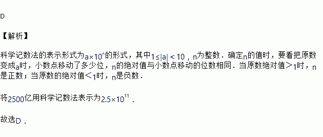 树叶上有许多气孔,在阳光下,这些气孔一边排出氧气和蒸腾水分,一边吸入二氧化碳.已知一个气孔每秒钟能吸进2500亿个二氧化碳分子,用科学记数法表示2500亿,结果是( )