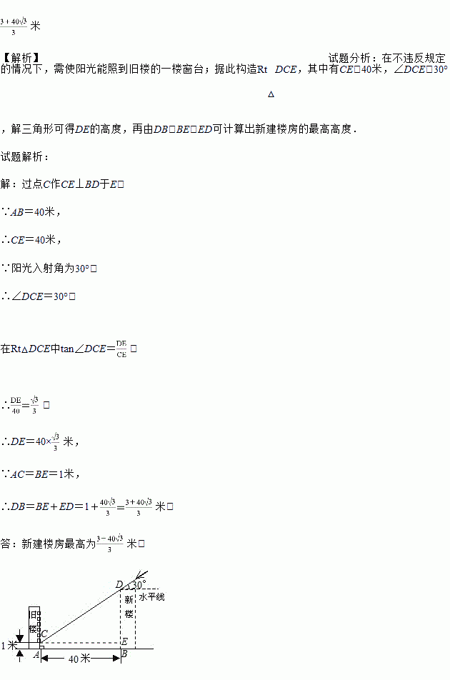 为解决楼房之间的挡光问题,某地区规定:两幢楼房间的距离至少为40米,中午12时不能挡光.如图,某旧楼的一楼窗台高1米,要在此楼正南方40米处再建一幢新楼.已知该地区冬天中午12时阳光从正南方照射,并且光线与水平线的夹角最小为30°,在不违反规定的情况下,请问新建楼房最高多少米?