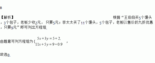 在早餐店里,王伯伯买5个馒头,3个包子,老板少收2元,只要5元;李太太买了11个馒头,5个包子,老板以售价的九折优惠,只要9元.若设馒头每个x元,包子每个y元,则下列哪一个二元一次方程组可表示题目中的数量关系?( )