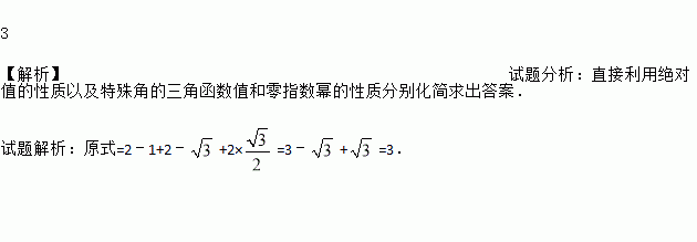 计算: ﹣(π﹣2016)0+|﹣2|+2sin60°.