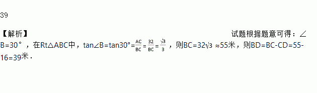 如图,某同学在楼房的A处测得荷塘的一端B处的俯角为30°,荷塘另一端D与点C、B在同一条直线上.已知AC=32米,CD=16米,则荷塘宽BD为________米(取