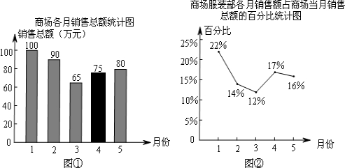 17.已知商场1~5月的商品销售总额一共是410万元.图①表示的是某综合商场今年1~5月的商品各月销售总额的情况,图②表示的是商场服装部各月销售额占商场当月销售总额的百分比情况,观察图①、图②,解答下列问题:(1)请你根据这一信息将统计图补充完整;