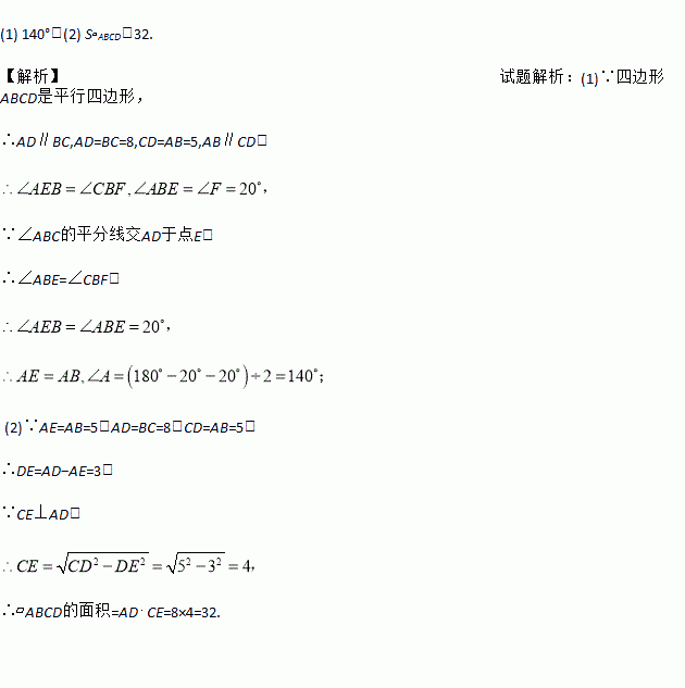 (2)若AB=5,BC=8,CE⊥AD,求□ABCD的面积.