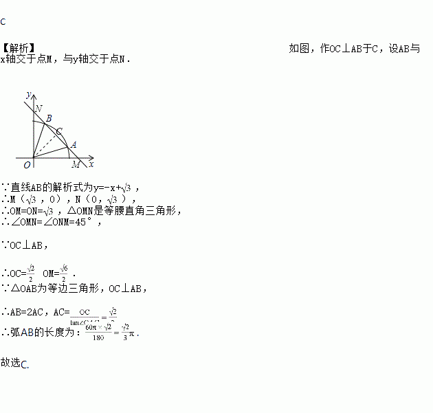 如图,以O为圆心的圆与直线y=-x+交于A、B两点,若△OAB恰为等边三角形,则弧AB的长度为( )