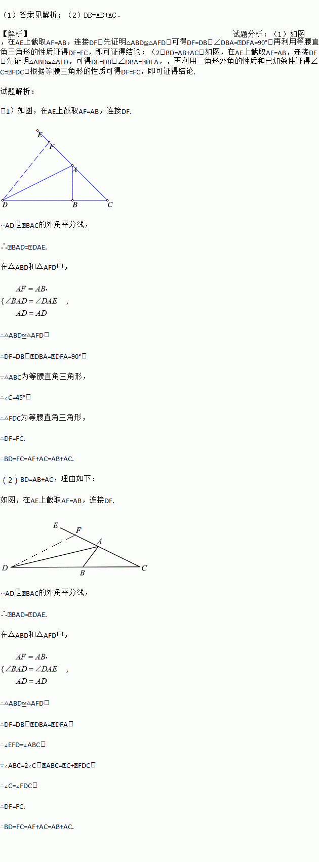 (1) 已知:如图1,等腰直角三角形ABC中,∠B=90°,AD是∠BAC的外角平分线,交CB边的延长线于点D.